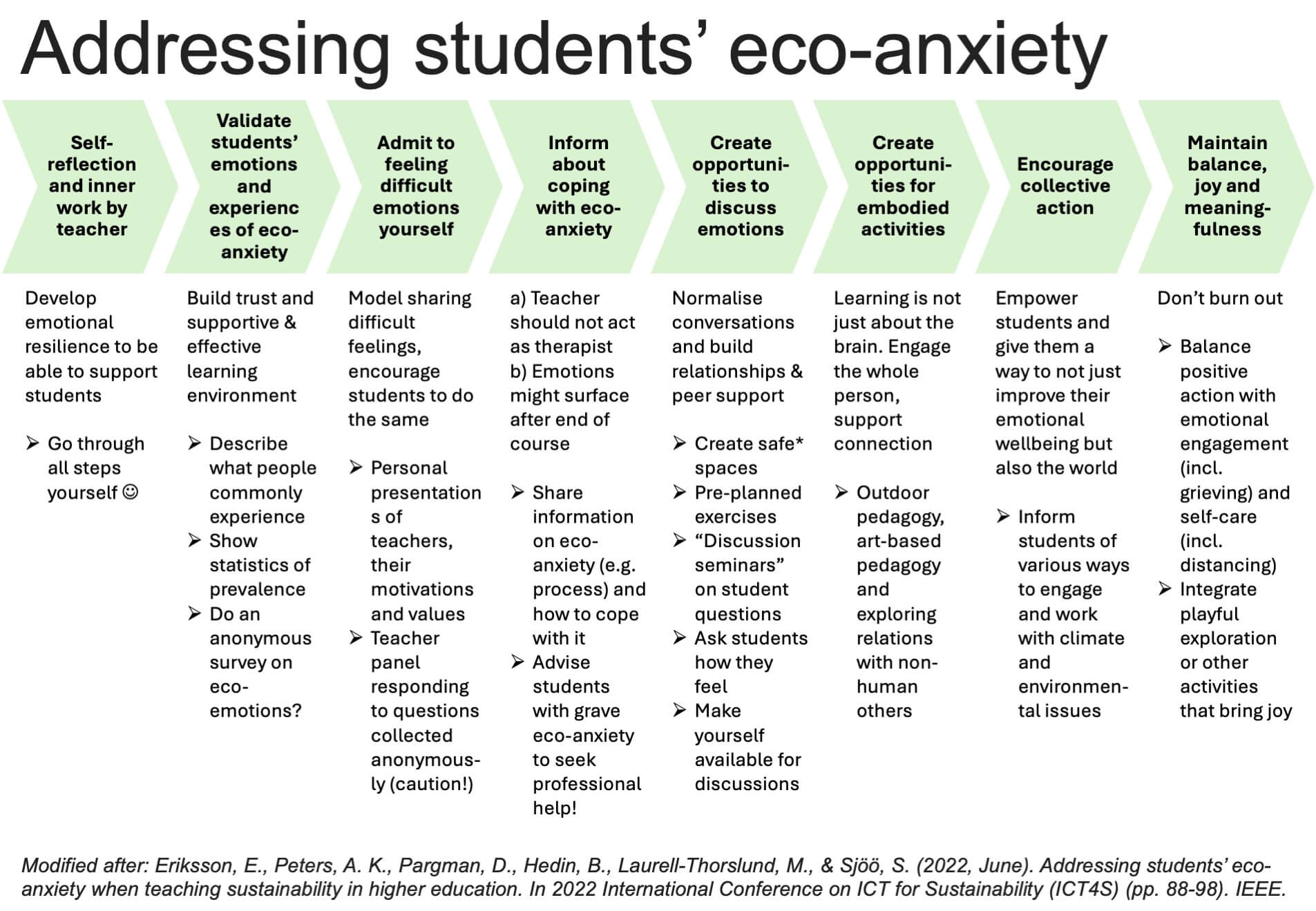 Eriksson, E., Peters, A. K., Pargman, D., Hedin, B., Laurell-Thorslund, M., & Sjöö, S. (2022, June). Addressing students’ eco-anxiety when teaching sustainability in higher education. In 2022 International Conference on ICT for Sustainability (ICT4S) (pp. 88-98). IEEE.